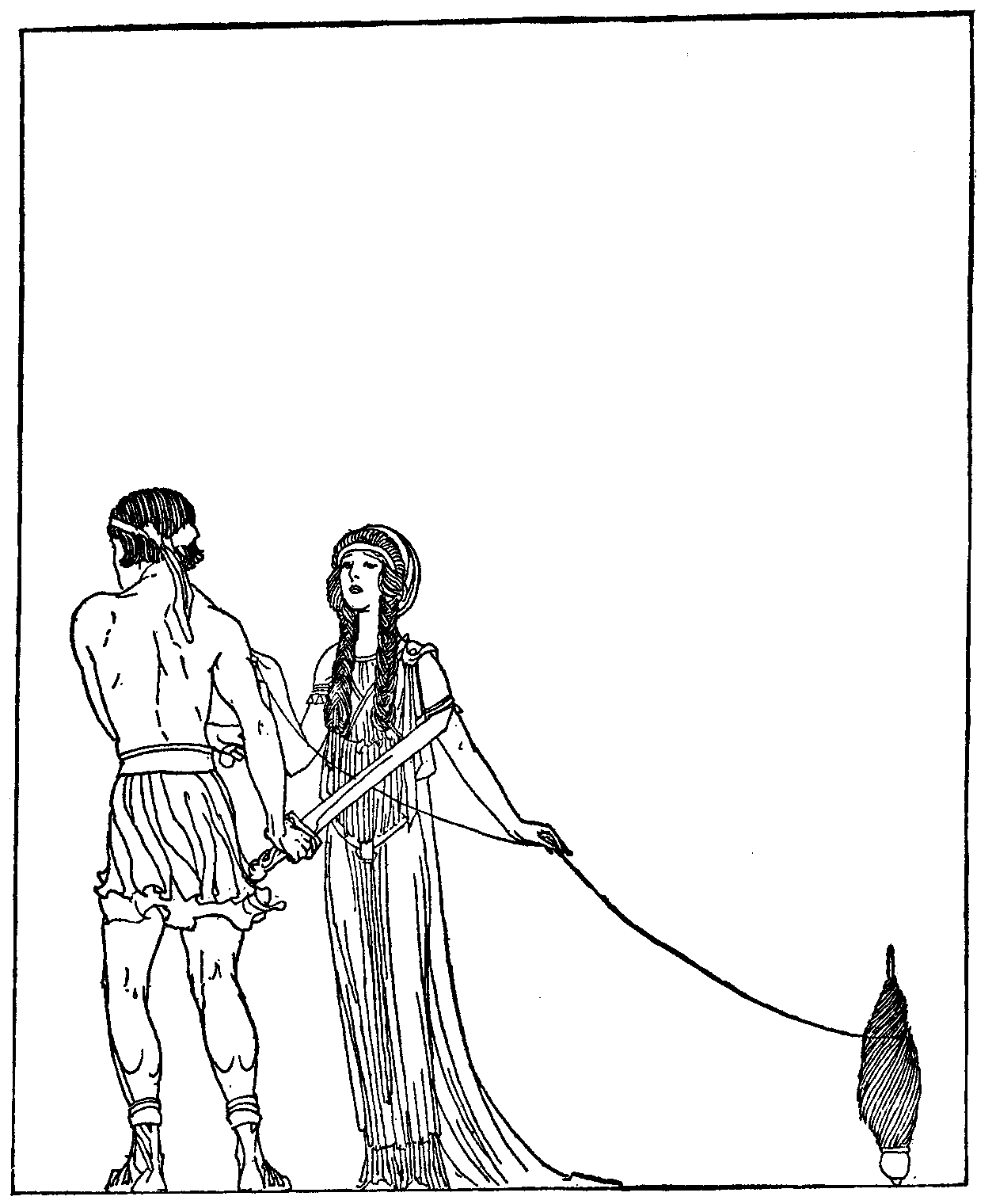 Theseus was sent by his father to convey the tribute of the Athenians to Minotauros. Ariadne fell in love with Theseus, and gave him the string  which she had received from Hephaestos, explaining to him that he should use it to find his way back out of the Labyrinth. Theseus in return promised to marry her (Plut. Thes. 19; Hygin. Fab. 42 ; Didym. ad Odyss. xi. 320)