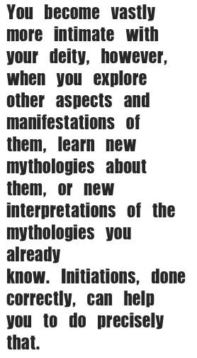You can become intimate with a deity without ever encountering another person at all. You become vastly more intimate with your deity, however, when you explore other aspects and manifestations of them, learn new mythologies about them, or new interpretations of the mythologies you already know. Initiations, done correctly, can help you do do precisely that.