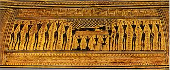 The Officiant now raises up the skull, dries it, places it on a small symbolic bier, silently places Oboloi or Talismans of Passage into the eyes of the skull, or attaches, in whatever way makes the most sense, the Orphic tablet. Then, a wreath is placed on its brow.