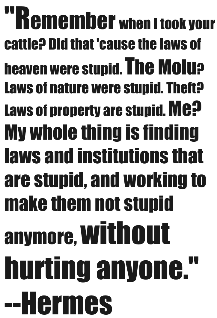 Hermes: Except. Remember when I took your cattle? Did that ’cause the laws of heaven were stupid. The Molu? Laws of nature were stupid. Theft? Laws of property are stupid. Me? My whole thing is finding laws and institutions that are stupid, and working to make them not stupid anymore, without hurting anyone.