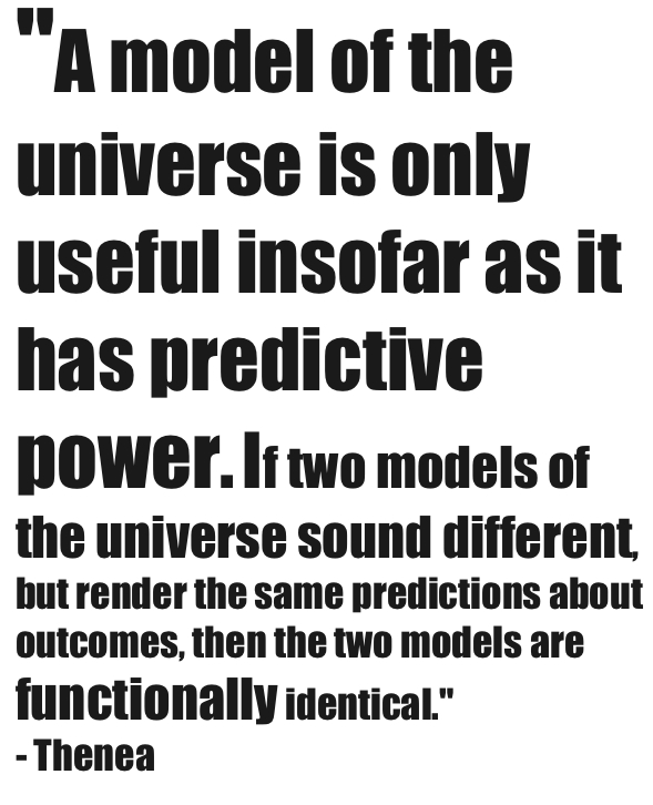 Thenea: A model of the universe is only useful insofar as it has predictive power. If two models of the universe sound different, but render the same predictions about outcomes, then the two models are functionally identical. Apollon: The same in all respects, I suppose.