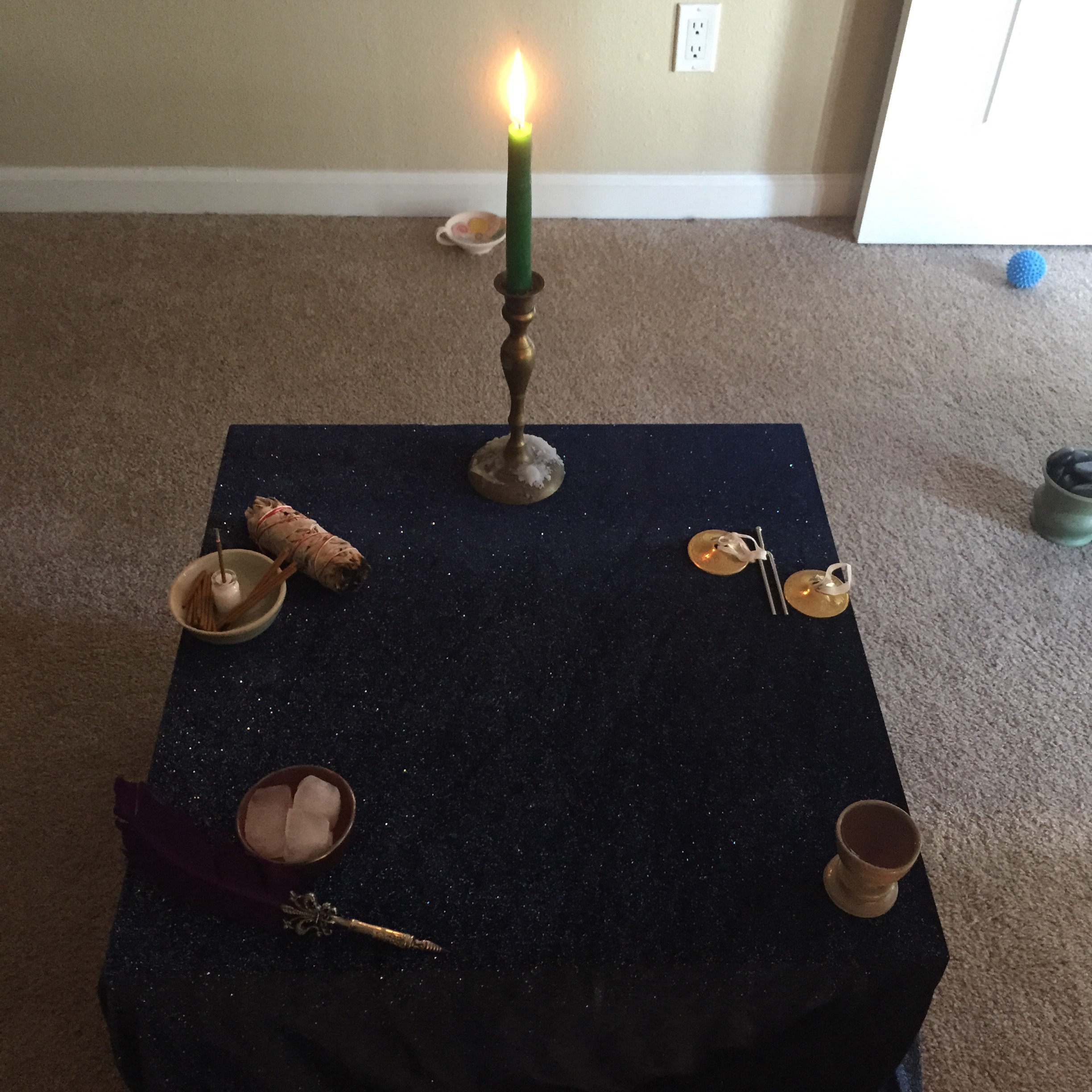 Have on hand a candle to represent Sight, a tuning fork to represent sound, a wine cup to represent Taste, a feather or quill to represent Touch, and incense to represent Smell.